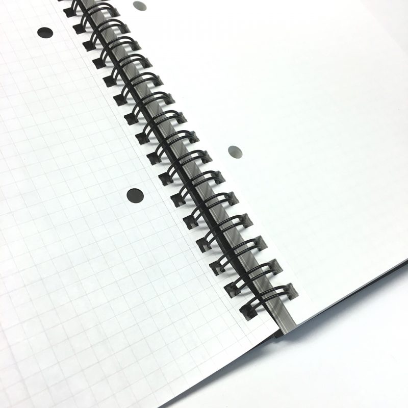 ノート部分には切り取り線と2穴のパンチ穴をあけています。これは、ノートを誰かに渡すとき、また別のファイリングをするときに役立ちます。そして、デュエットリングノートの一番の特徴は方眼ページと無地ページの両方を使うことができるということです。片側ページのみに筆記するという使い方もあれば、左ページの方眼部分と右側の無地部分に絵や図を描いたり、資料を貼り付けたりといった使い方もできるように、しっかりとした厚みのある紙を採用しています。