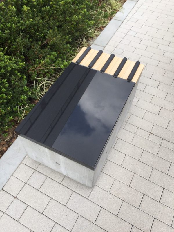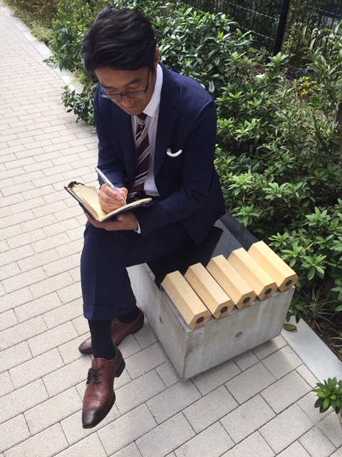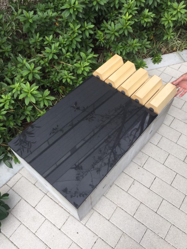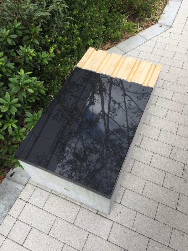 三菱鉛筆本社の敷地にあるベンチは、座面の一部が鉛筆の形をしていて、順にみていくと鉛筆の作り方が分かる仕掛けになっています。