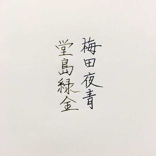 当店が思いをこめて初めて作ったオリジナルインク、「梅田夜青」、「堂島緑金」も、私の「この色を作って欲しい!」という思いを120%表現してくださいました。梅田夜青は「普段使いで使える青だけれども、限りなく夜空の黒に近い色。梅田の空は街の明かり、お店のネオンで夜でも真っ暗じゃない。少し青みがかった黒。」というオーダー。堂島緑金は「お店のある堂島の守り神である薬師堂をイメージしている。時事刻々と移り変わる堂島薬師堂の色の変化を楽しめる色にして欲しい。緑でもあり金色でもある。そんな色の変化を楽しめる色。」というオーダー。ふたつとも見事に再現頂いています。以降の8色のインクも思いとストーリがしっかりと表現されています。今月発売のオリジナル万年筆、「お初」もしっかりと思いが表現されていることと思います。
