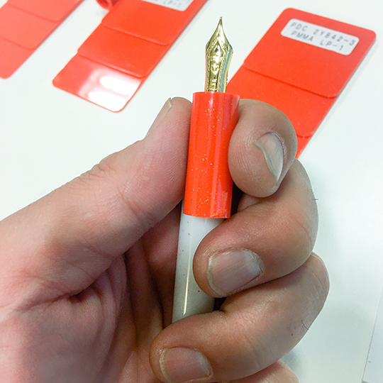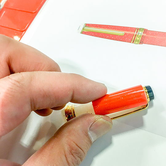 当店にはいくつかの当店オリジナルの商品がございます。昨年の10月に露天神社(お初天神)さんを舞台とした近松門左衛門作の人形浄瑠璃、「曽根崎心中」の登場人物から「徳兵衛」をイメージした万年筆を発売致しました。そして、来たる2018年5月28日に「お初」をイメージした万年筆が発売予定となります。セーラー万年筆のプロフェッショナルギアをベースにお初をイメージした特別色の樹脂を作成、我ながら良い色に仕上がるのではないかと楽しみにしています。