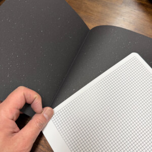 当時まだまだノートは安価で、1冊1000円を超えるノートはあまり世の中になかった中、1500円という値段のノートを世に生み出しました。本文用紙は鉛筆やシャープペンシル、ボールペンでも書き心地が良い紙を選びました。罫線は5mmの枠をはみ出してしまう人のために7mmに、そして印刷色は見えるか見えないかくらいの薄くて細い罫線をあしらって。さらには表紙の紙やミカエシの紙にもこだわり、梅田の夜空に輝く星をイメージしたノートを仕上げました。そして、そのノートをUmeda Noteと名付けました。