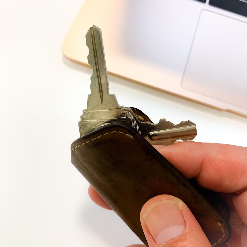最後にキーカバー。これはもう実は2代目です。今や家や車はタッチするだけで鍵が開く時代、家の鍵も車の鍵も基本的にはカバンの中でOKです。しかしながら、事務所の鍵だけが唯一のストレスでした。普通のキーケースは結構かさばるし、カラビナやリングだとポケットの中でジャラジャラ言うし。。。そんな時に出会ったのがこのキーカバーでした。事務所の鍵とシャッターの鍵さえあれば良いので、一番スリムなサイズでOKです。ほぼ毎日一緒にいるキーカバーは、自分と同じように歳をとっていっているような気がします。ベルロイの革は非常に丈夫で、しかもいい感じにエイジングします。縫製もしっかりとしているので、毎日、長期間使用しても大丈夫。まさにパートナーといったところでしょうか。