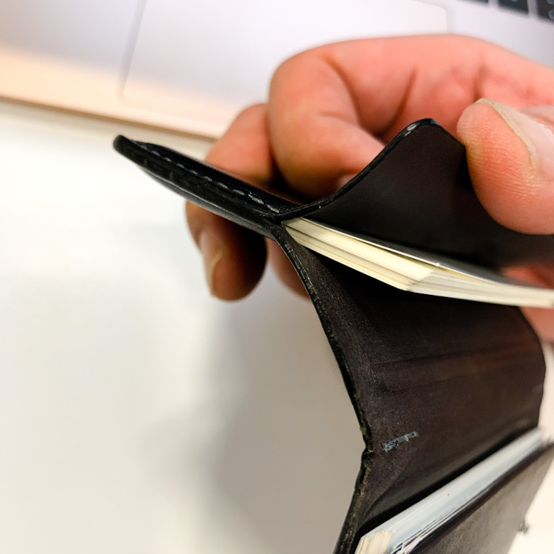 次に名刺入れ。昔はたくさん名刺を入れて、たくさんの人と名刺交換して、たくさん名刺を持ち運ぶスタイルでしたが、色々な管理アプリがあったり、SNSで繋がった方が色々と便利という場合もあります。なので、名刺も最低限の枚数で大丈夫。だったらスリムな方がいいと思います。しかもスリムと言ってもかなりの容量があり、素材とデザインでスリムさを演出しているのがベルロイの最も魅力的なところかも知れませんね。