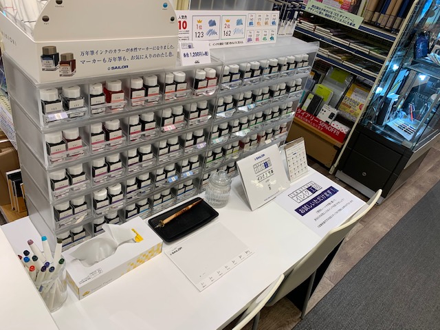 おしゃれな雰囲気の店内で、いろいろな種類の万年筆インクを試し書きできたり、カラフルなデザインのロシアの万年筆が展示されている素敵なお店でした。