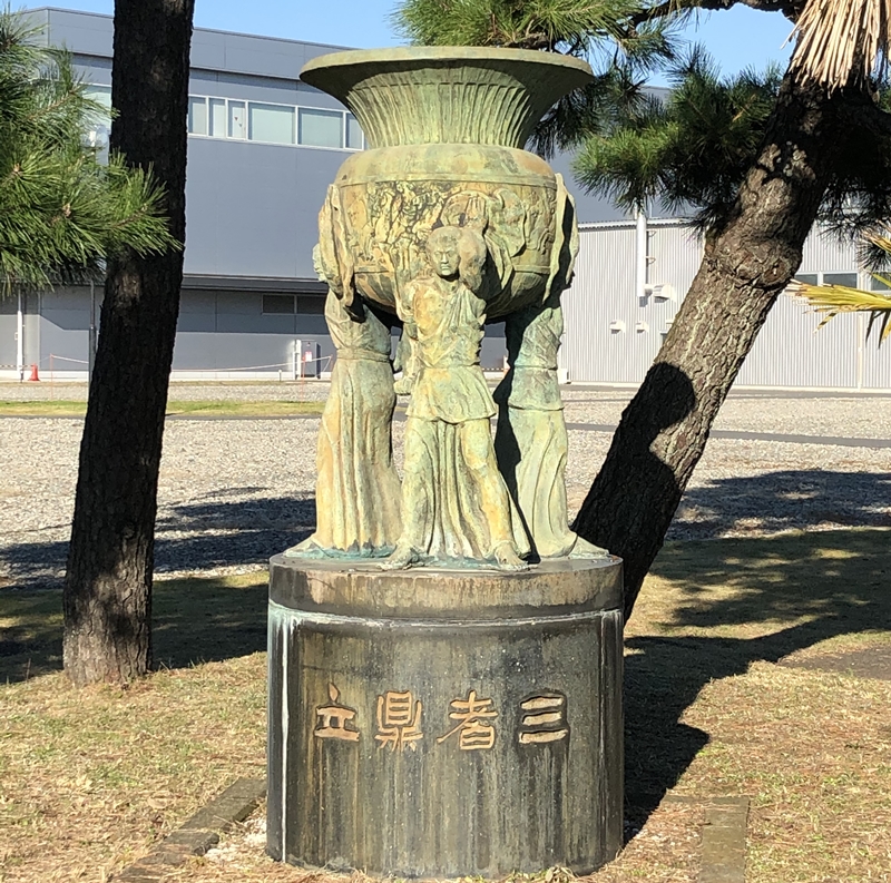 広い場内を歩いて蒔絵工房に向かう途中に、こんなブロンズ像を見つけましたよ。