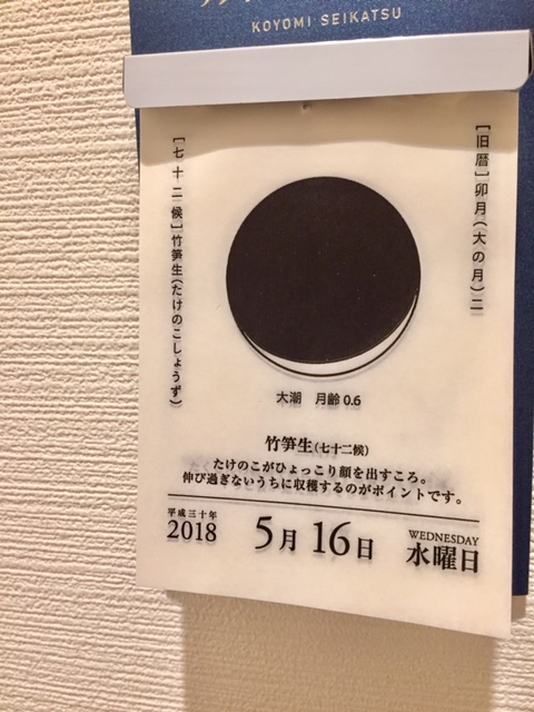 まず向かう先はトイレです。我が家のトイレには新日本カレンダーの月の日めくりカレンダーがあります。寝ぼけて座ると丁度目の前に飛び込んできます。なのでここで今日がどんな日なのかをチェックします。季節の食材や24節気など、毎日なんとなく感じているつもりの季節も、そろそろカエルが鳴きはじめますとか、つくしが芽を出す頃ですとか、そんな事を毎日教えてくれます。月の日めくりカレンダーはその日に見えるお月様がわかりやすくて、晴れている日なんかだと帰宅時間がちょっと楽しみになります。(まだ働いてもないのに・・・)