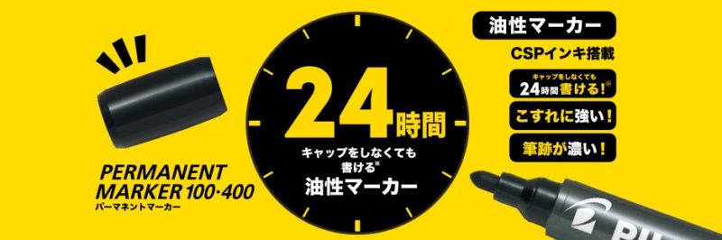 パーマネントマーカーは、特殊添加剤による皮膜がペン先をコーティングしインクの蒸発を防ぐため、キャップをしないで24時間経っても、書くことができます。