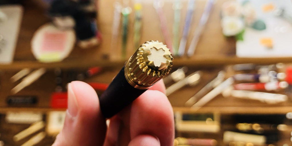 回転式で芯を繰り出すのですが、ローレット型頭冠を採用し、トップ部分にはサクラのマークの削り出し…格好良すぎますね!