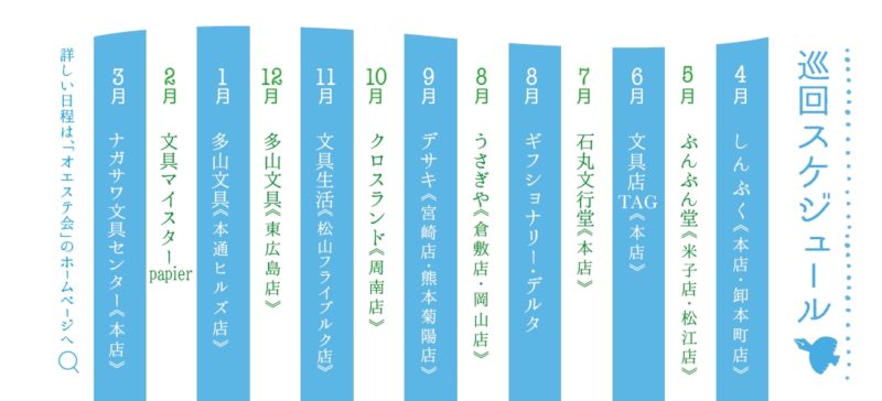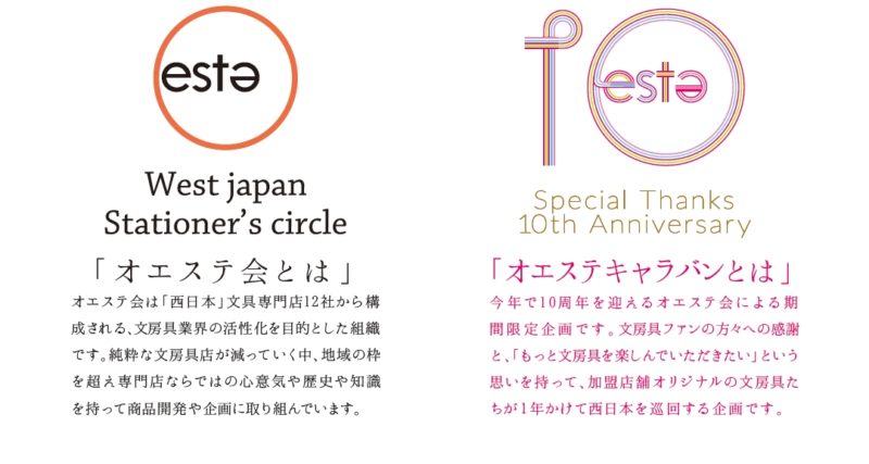 オエステ会は今年で結成10周年を迎え、本企画はその記念企画の一環としてスタートします。西日本の文房具のプロがこだわりを持って企画・製造した商品、インターネット上で見るだけで実際に試せなかった商品も、西日本各地にて触れる事が出来ます。巡回予定を参考にこの機会をお見逃しなく、ぜひお楽しみください。