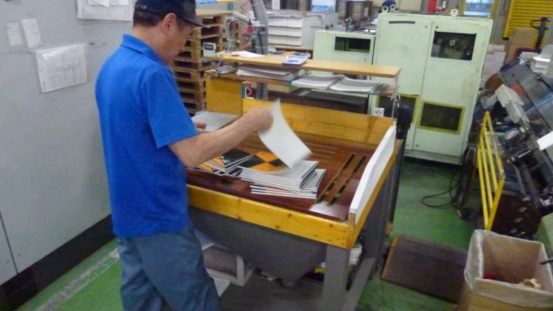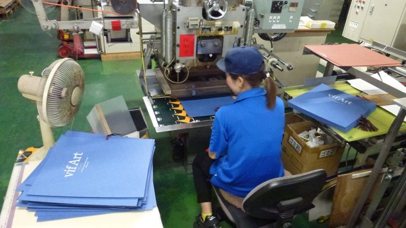 ちょうどヴィファール水彩紙の表紙の加工風景です。