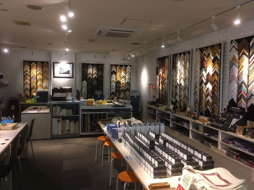 圧巻は、壁面一面に白い煉瓦で埋め尽くし改装のメインでもあるモールディング(額縁見本)の展示とワークショップコーナーです。約800種類のモールディング(額縁見本)をご用意させて頂きました。